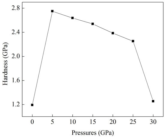Figure 6 shows the hardness of Mg2Ni at different pressures. It is a fact that at pressures ranging from 0 to 5 GPa, the hardness increases proportionally with the rise in pressure. However, when the pressure exceeds 5 GPa, with increasing pressure, hardness tends to decrease.