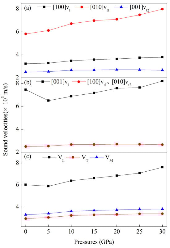 (a) Velocities of longitudinal and transverse sound (, , and ) of Mg2Ni in the [100] direction at different pressures; (b) velocities of longitudinal and transverse sound (, , and ) of Mg2Ni in the [001] direction at different pressures; and (c) longitudinal sound velocity (), transverse sound velocity () and mean sound velocity () of Mg2Ni crystals at different pressures.