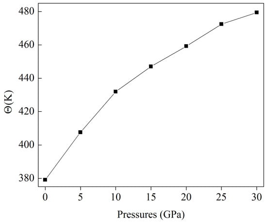 Figure 9 shows the Debye temperature of Mg2Ni for different pressures. It is evident from the figure that the Debye temperature of the Mg2Ni alloy rises with increasing pressure. This phenomenon can be attributed to pressure’s influence on the electron structure and interatomic interactions within the material. Under high pressure, the interatomic distance decreases, thereby intensifying interatomic interactions. This heightened interaction subsequently elevates the material’s Debye temperature, resulting in heightened thermal stability and resistance to deformation under high pressure. Consequently, the Debye temperature of the Mg2Ni escalates with increasing pressure.