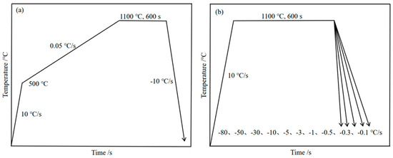 Thermal expansion instruments were utilized to simulate the temperature–time curves depicted in Figure 1a for two types of steel specimens. Tangents were drawn to the heating segment of the resulting temperature-thermal expansion curve, with the inter-critical points identifying the critical phase transformation points for each test steel. In accordance with industry standard YB/T 5128-2018, a simulation test was conducted on 0.15Cu-DH steel using a thermal dilatometer as depicted in Figure 1b, to determine the CCT curve for 0.15Cu-DH steel. Initially, each test steel was raised to 1100 °C at a rate of 10 °C/s and held for 10 min to fully austenitize the specimens. They were then cooled to room temperature at rates ranging from 0.1 to 80 °C/s, respectively, to yield the expansion–temperature curves for each specimen at each cooling rate. Each cylindrical specimen was cut in half from one-half height along the circular surface and inlaid, and the microstructure of the cut surface was characterized under SEM to determine its continuous cooling transition curve. At each cooling rate, six positions were randomly selected and measured using a micro-Vickers hardness tester, with results averaged after discarding the maximum and minimum values.