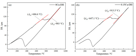 Figure 2a,b depict the expansion–temperature curves determined by DIL 805 thermal dilatometer for the critical points of 0Cu-DH and 0.15Cu-DH steel, respectively. The Ac1 temperature for 0Cu-DH steel during heating is 686.6 °C, and its Ac3 temperature is 903 °C, as determined by the tangent method; The Ac1 temperature for 0.15Cu-DH steel is 647.1 °C, with an Ac3 temperature of 913.5 °C. The ferrite+austenite two-phase region for 0.15Cu-DH steel is slightly larger than that of 0Cu-DH steel.