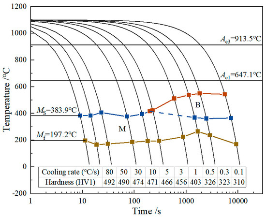 The CCT curve of the thermal expansion specimen of 0.15Cu-DH steel is depicted in Figure 3. When the cooling rate ranges from 0.1 to 80 °C/s, the steel’s hardness decreases as the cooling rate decreases, correlating with a reduction in martensite and an increase in bainite [14]. At cooling rates between 0.1 and 0.5 °C/s, the steel’s microstructure is predominantly bainite, resulting in a lower hardness of approximately 320 HV1. As the cooling rate increases from 0.5 to 3 °C/s, the martensite content increases, the bainite transformation decreases, and the hardness elevates. When the cooling rate exceeds 5 °C/s, the steel’s microstructure becomes entirely martensitic [15], exhibiting a high hardness exceeding 460 HV1. B is the bainite transformation phase region and M is the martensite transformation phase region.