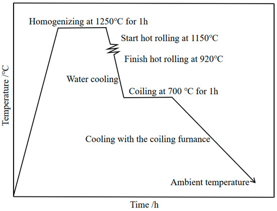 The chemical composition of 0Cu-DH steel and 0.15Cu-DH steel is depicted in Table 1. The raw materials are initially melted in a vacuum smelting furnace, and subsequently cast to form steel ingots. These ingots are heated to 1200 °C for 30 min, then forged to produce elongated forging billets. To facilitate laboratory rolling, the forging billets are cut into rectangular shapes measuring 30 mm in thickness, 80 mm in width, and 100 mm in length.
