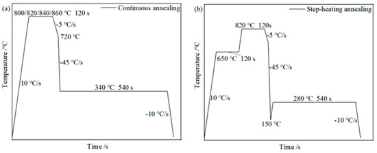 Processing map of heat treatment. (a) Continuous annealing; and (b) step-heating annealing.