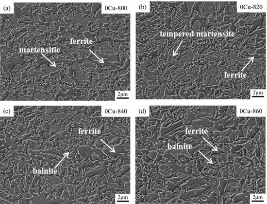 Microstructure of 0Cu-DH steel annealed at 800~860 °C: (a) 800; (b) 820; (c) 840; and (d) 860.