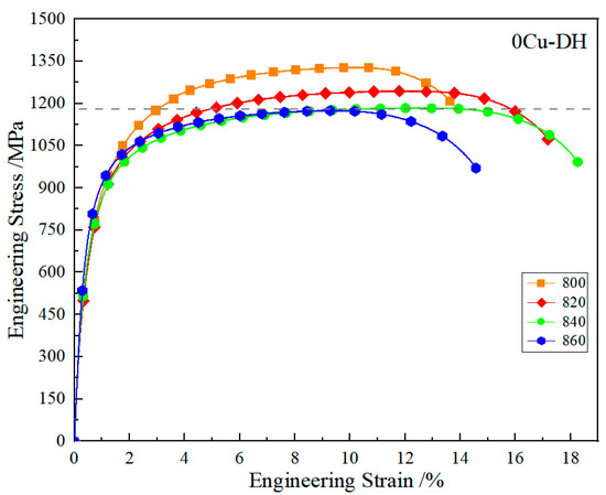 Tensile curves of 0Cu-DH steel annealed at 800~860 °C.