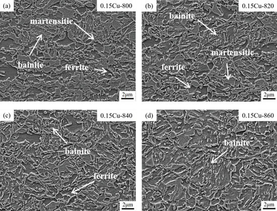 Figure 8 shows the microstructure of 0.15Cu-DH steel during continuous annealing in the annealing temperature range of 800~860 °C.