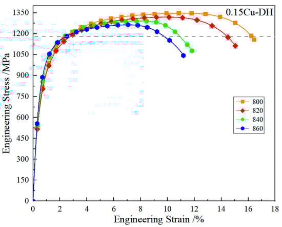 Tensile curves of 0.15Cu-DH steel annealed at 800~860 °C.