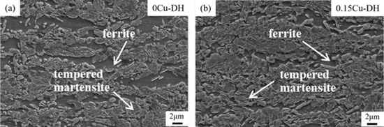Microstructure of test steels at step-heating annealing process: (a) 0Cu-DH steel; and (b) 0.15Cu-DH steel.