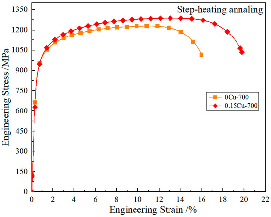 Under the step-heating annealing process, the mechanical properties of the test steel meet the standards of DH1180. The tensile strength of 0Cu-DH steel is 1231 MPa, and the elongation after fracture is 16.0%. The 0.15Cu-DH steel achieves an excellent strength-plasticity match of 1289 MPa × 19.8%, as shown in Table 5 and Figure 11. The hole expansion rates of 0Cu-DH steel and 0.15Cu-DH steel are 19.5% and 21.9%, respectively, which are superior to those of the test steel under the traditional continuous annealing process. The rate of hole expansion loss is 21.5% and 10.0%, respectively, which is significantly lower than that under the traditional continuous annealing process.