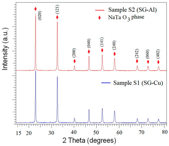Using the sol-gel method, two samples were synthesized: a sample of sodium tan-talate (NaTaO3) doped with Cu metal ions (NaTaO3:Cu), hereafter named sample S1 (SG-Cu) and another sample doped with Al ions (NaTaO3:Al), hereafter referred to as sample S2 (SG-Al). The amount of dopant ions of Cu and Al was 1%, in a weight ratio. For the synthesis of samples, purely analytical chemicals (99.98%) were used (purchased from Aldrich, St. Louis, MO, USA). Tantalum ethoxide (Ta(OC2H5)5) (1 mL), solution of ethyl alcohol (1:1) and distilled water were used. The precipitation was carried out at room temperature, with sodium hydroxide solution (1M NaOH), at pH = 7, under continuous magnetic stirring. For the synthesis of NaTaO3 doped with Cu or Al, 0.04 g of Cu(NO3)2 and 0.04 g Al(NO3)3, respectively, were added to the suspension, under continuous stirring. The resulting mixtures were heated for 2 h at a temperature of 90 °C and the products thus obtained, in the form of a gel, were then dried in an oven at 110 °C for 4 h. Finally, for crystallization and obtaining the perovskite phases, NaTaO3 samples doped with Cu and Al were subjected to heat treatment for 6 h at a temperature of 600 °C, with a heating rate of 5 °C/min. The materials thus obtained were in powder form.