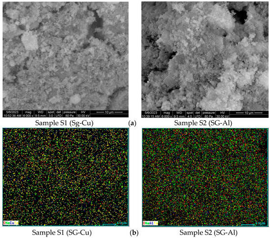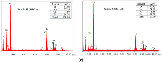 From the SEM images of samples (Figure 2a), one can observe that for both samples the particles have a spherical shape, with dimensions of hundreds of nanometers, and are strongly agglomerated. Also, element’s mapping (Figure 2b) revealed uniform distribution of all present elements: O, Na, Ta and metal ions used as dopant (Cu or Al).