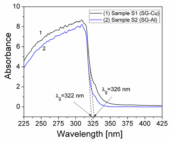 Figure 3 shows the UV-VIS absorption spectra of the samples. The wavelength λg, at the end of the absorption range was determined as the intersection between the wavelength axis and the tangent line drawn on the absorption spectrum. As can be seen from Figure 3, the λg values of the two samples are λg = 326 nm for sample S1 (Sg-Cu) and λg = 322 nm for sample S2 (SG-Al). Using the Kubelka–Munk method [29], the values of λg from Figure 3 and Equation (1), the values of the band gap energy (Eg) of the investigated samples, were computed [30].