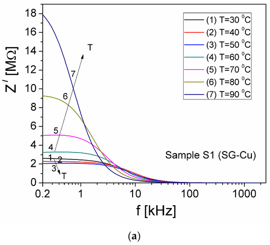 The frequency and temperature dependencies of the Z′ and Z″ components of the complex impedance of the samples, in the frequency range 200 Hz–2 MHz and at different temperatures between 30 and 90 °C are shown in Figure 4 for sample S1 (SG-Cu) and in Figure 5 for sample S2 (SG-Al).