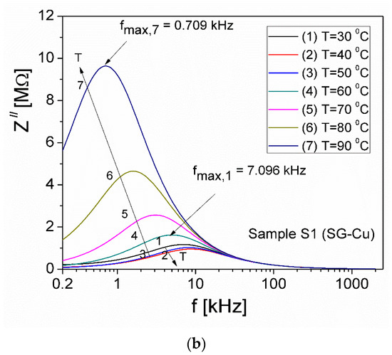 From Figure 4b and Figure 5b one can be observe that the imaginary component Z″ presents a maximum at frequency fmax,Z for both samples and for all investigated temperatures. For both samples, fmax,Z shifts towards higher values when the temperature increases up to approximately 50–60 °C, after which the temperature continues to increase up to 90 °C, fmax,Z moves towards smaller values.