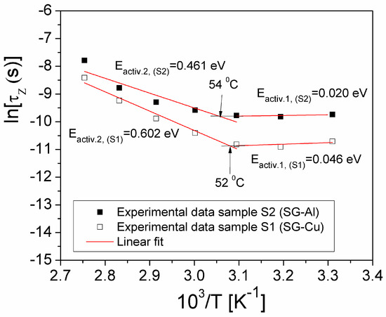 Figure 6 shows the plot of the experimental dependence, ln(τZ), on (103/T) for the investigated samples. The linear fit of the curves in Figure 6 provides two different slopes for each sample, which correspond to the two temperature ranges: below 52 °C and above 52 °C (for sample S1) and below 54 °C and above 54 °C (for sample S2), respectively. These temperature dependencies of τZ could be associated with two ranges of different electrical conductivity of the samples [38]. From the fitting with a straight line, of equation y = a + bx, where a is the intercept and b is the slope of the line, we determined the values of the activation energy, Eactiv., of samples S1 and S2, corresponding to the two temperature ranges. The obtained values are 0.046 eV (below 52 °C) and 0.602 eV (above 52 °C) for sample S1 (SG-Cu) and 0.020 eV (below 54 °C) and 0.461 eV (above 54 °C) for sample S2 (SG-Al), respectively. As a result, it can be stated that for the samples of NaTaO3 doped with Cu and Al ions respectively, we highlighted for the first time a transition from a semiconductor-like behavior to a conductor-like behavior, at a temperature of 52 °C for sample S1 (SG-Cu) and a temperature of 54 °C for sample S2 (SG-Al) respectively, where the change in the activation energy, Eactiv., also appears (see Figure 6).