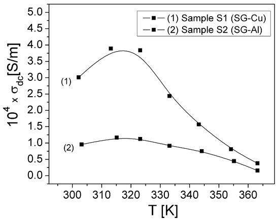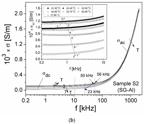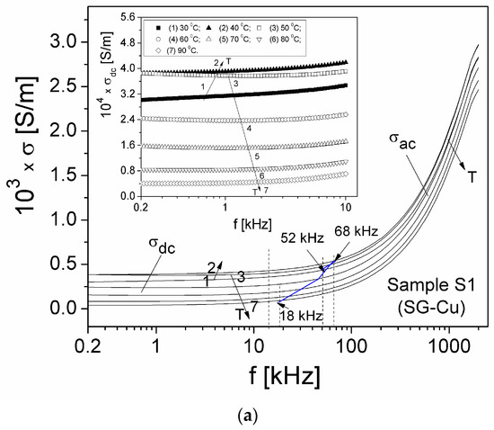 The frequency dependence of the conductivity, σ, of the investigated samples over the frequency range (200 Hz–2 MHz) and at different temperatures between 30 and 90 °C, is shown in Figure 7a for sample S1 (SG-Cu) and Figure 7b for sample S2 (SG-Al), respectively.