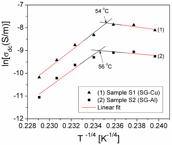 Figure 9 shows the experimental dependence ln(σdc)(1/T1/4), for the two samples at low frequencies. The linear fit of the curves in Figure 9, corresponding to both sample S1 (SG-Cu) and sample S2 (SG-Al), shows that the slope of the conductivity changes at T = 54 °C (for sample S1) and at T = 56 °C (for sample S2). This result is in agreement with the variation of the relaxation time, τZ with temperature, shown in Figure 6, which was associated with two ranges of different electrical conductivity of the samples. Thus, the result obtained in Figure 9, highlights once again the fact that the temperatures of 54 °C for sample S1 (SG-Cu) and 56 °C for sample S2 (SG-Al), represent the transition temperature from a semiconductor-type behavior to a conductor-type behavior, also taking place a change of the activation energy of conduction, Ea,cond, of the samples, as we also obtained in Figure 6. At the same time, by increasing the temperature to approximately 50–60 °C, the doping ions of Cu and Al, respectively, induce in the NaTaO3 structure, a transition from the semiconductor-like to conductor-like behavior of the TaO compounds [41]. Considering the paper [41], we can say that in the case of NaTaO3 samples doped with Cu ions (sample S1) and respectively with Al ions (sample S2), Cu-Ta and Al-Ta bonds are formed on the TaO surface, which introduce holes as the main charge carrier and, consequently, the Fermi level is shifted into the valence band, where electronic states are now populated. As a result, it can be said that in the analyzed samples a metallic transition takes place at a temperature located between 50 and 60 °C, called transition temperature, thus highlighted for the first time in perovskite compounds of this type.