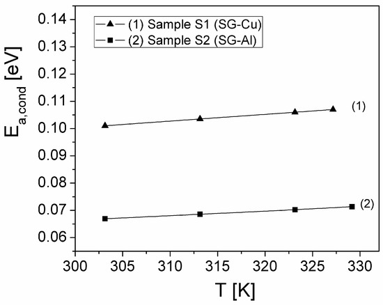 From the straight-line fitting of the experimental dependence, ln(σdc)(1/T1/4), from Figure 9, for each sample, we determined the slope D, corresponding to the interval (30–54 °C), for sample S1, and for the temperature range (30–56 °C) for sample S2, respectively, in which the samples show a semiconductor-like behavior. Then with the relation Equation (6) we computed the activation energy of conduction, Ea,cond(T), for each sample. Figure 10 shows the temperature dependence Ea,cond(T), for the S1 (SG-Cu) and S2 (SG-Al) samples.