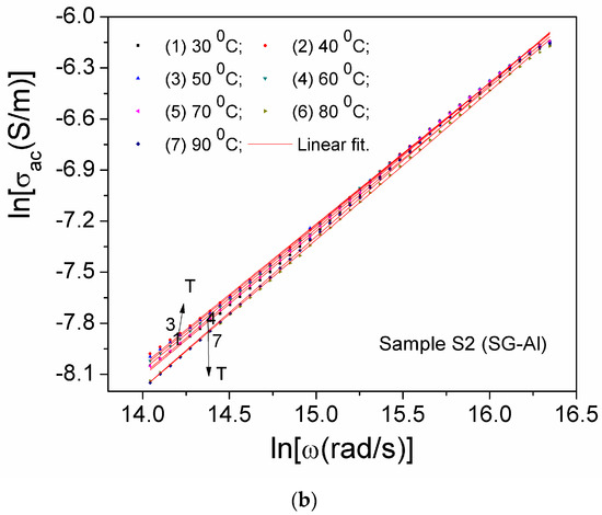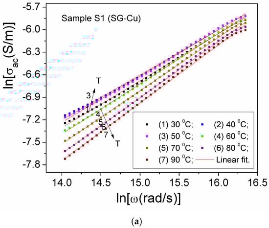 where n is a temperature-dependent exponent (0 < n < 1) and A0 is a pre-exponential factor that depends on temperature [39]. By taking the logarithm of Equation (10), a linear dependence between lnσac and lnω is obtained. Figure 11a,b shows the experimental dependence of ln(σac) on ln(ω) for samples S1 (SG-Cu) and S2 (SG-Al) at each temperature T.