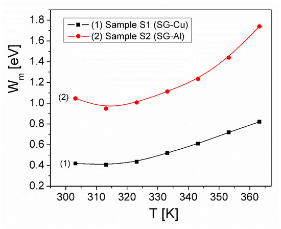 In Equation (11) Wm represents the maximum energy barrier height (or band gap energy) [45,46] and can be calculated using Equation (11) and the n values of the two samples (Table 3) corresponding to each temperature T. The temperature dependence of the maximum energy barrier height, Wm(T), is shown in Figure 12 for the two samples.