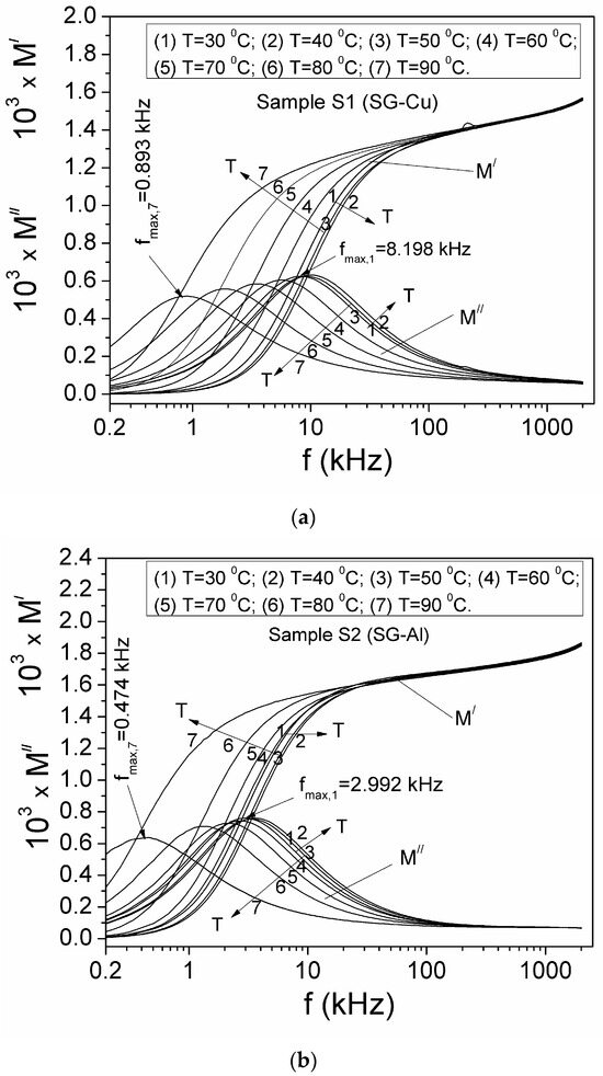 In these relationships, ε0 is the free space dielectric permittivity. Using Equations (14) and (15) and the Z′ and Z″ values from Figure 4 and Figure 5, we determined the components M′ and M″ of the electrical modulus for the two samples. Figure 13 shows the frequency dependence of the M′ and M″ components at all investigated temperatures, T, for both sample S1 (SG-Cu) (Figure 13a) and sample S2 (SG-Al) (Figure 13b).
