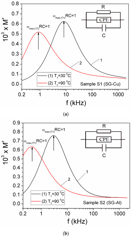 The elements R and C of the parallel circuit influence the shape of the M″(f) peaks (Figure 13) and the amplitude of the peak in the M″(f) curves is proportional to the capacity C, i.e., M″max = C0/2C where C0 is cell capacity without sample (C0 = 0.0115 pF). Knowing the M″max (Figure 13) and τM values (Table 4), both the elements Cg and Rg of the equivalent parallel circuit, corresponding to the samples, at each temperature, T, were determined. The obtained values are shown in Table 4. The constant phase element “Q” can be computed from Equation (16) taking into account the values of Rg, Cg (Table 4) and n (Table 3) corresponding to samples S1 (SG-Cu) and S2 (SG-Al). The values obtained for the phase element constant “Qg” are indicated in Table 4.