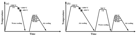 The chemical composition of the steels prepared in this study is shown in Table 1. The slabs were smelted and produced by Nanjing Iron and Steel Group (Nanjing, China), based on the Nangang wide plate production line. The billets were heated to 1200 °C and held for 2 h, and then controlled rolling was carried out in two stages. The first stage was rolled in the recrystallization zone greater than 1000 °C, and the second stage was rolled with the final rolling temperature of ~850 °C. The plates were rolled to a thickness of 48 mm. Subsequently, direct quenching + tempering (DQT) and off-line quenching + tempering (QT) were employed, respectively, and the steels, after off-line quenching, were reheated to 900 °C for austenization. To analyze the effect of Nb addition on the microstructure and mechanical properties of the DQT steels and QT steels, the tempering was set at 550 °C for 40 min. On this basis, the steels were then tempered at 450 °C and 650 °C, respectively, to fully discuss the effect of quenched microstructure on the precipitation behavior of Nb at different tempering temperatures. The schematic diagrams of the heat treatment processes are shown in Figure 1.
