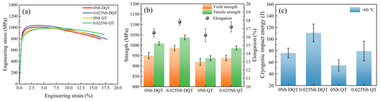 The engineering stress–strain curves and tensile properties of the prepared hydropower steels are shown in Figure 2a,b. Due to the combined effect of solid solution strengthening and precipitation strengthening of Nb, the yield strength of 0.025Nb steel after DQT reaches the highest value of 986 MPa, the tensile strength is as high as 1037 MPa, and the elongation after fracture is still 17.5%. The addition of 0.025%Nb resulted in the optimum tensile properties of the steel.