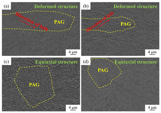 The DQT and QT treatments were performed on 0Nb steel and 0.025Nb steel, respectively. The tempering temperature was 550 °C, and the SEM micrographs are shown in Figure 3. It can be seen from Figure 3a,b that there are obvious deformation microstructure characteristics of the two steels after DQT, and the prior austenite grains are elongated along the rolling direction, indicating that the lower finishing-rolling temperature and larger pass reduction are adopted in the rolling process, and the direct quenching retains this deformation microstructure characteristics. After tempering, the sub-boundaries in the steels became blurred, and the martensite laths recovered with a large number of precipitated cementite particles and carbide particles. Nb is a strong carbonitride-forming element that can form carbides and nitrides with high melting points and high hardness [30]. It can play two roles in steel. First, because the precipitates have a high melting point and precipitate on the austenitic grain boundaries, their solid solubility at high temperatures is low, which can prevent the growth of austenitic grains, thereby greatly refining the grains [31]. The second is that Nb dissolved in austenite will precipitate during the transformation process of austenite, which will hinder the movement of dislocations in the lattice of iron atoms, further improving the strength [32]. Therefore, compared to 0Nb steel, the grain size and precipitate size of 0.025Nb steel are significantly refined. In addition to the cementite particles, there are also a large number of Nb precipitates, which will be discussed in detail in Section 3.4. The combined effect of fine-grain strengthening and precipitation strengthening increased the yield strength and tensile strength of 0.025Nb steel by about 36 MPa, and the Nb precipitates had no adverse impact on ductility. From the results of cryogenic impact energy at −60 °C, it can be seen that the grain refining effect brought about by the addition of Nb not only further improves the strength, but also increases the barrier effect on crack growth, resulting in a significant improvement in low-temperature impact toughness. The 0.025Nb steel reached a cryogenic impact energy over 100 J at −60 °C, achieving excellent strength–toughness matching. Figure 3c,d show that the microstructure of the QT-treated 0.025Nb steel is also somewhat refined compared to that of the 0Nb steel, but not as pronounced as that obtained after the DQT process.