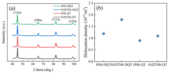 (a) XRD patterns and (b) dislocation density of the prepared steels after different heat treatment processes.