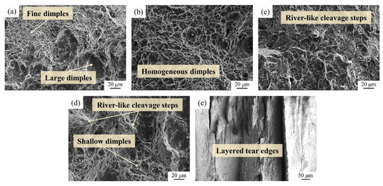Impact fracture micrographs of 0.025Nb steel under different processes. (a) DQT as-quenched, (b) DQT tempering at 550 °C, (c) QT as-quenched, (d,e) QT tempering at 550 °C.