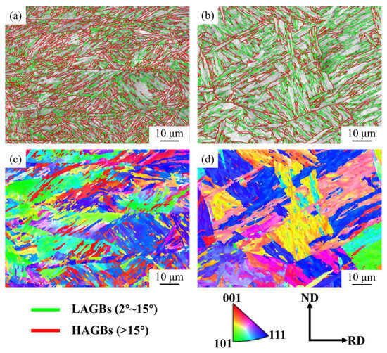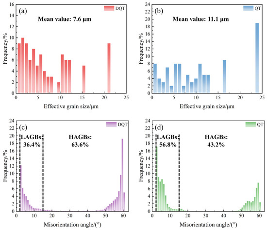 EBSD micrographs of 0.025Nb steel under DQT and QT processes. Grain boundary distributions: (a) DQT, (b) QT; IPF: (c) DQT, (d) QT.