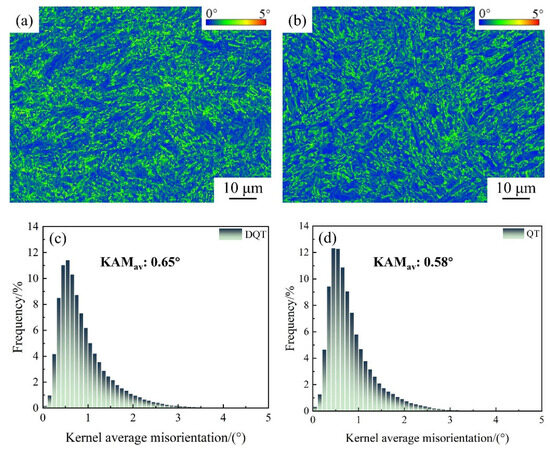 In addition to fine grain strengthening and precipitation strengthening, dislocation strengthening is also the main strengthening mechanism for HSLA steels. Figure 8a,b show the kernel average misorientation (KAM) under two processes. It is obvious from the figure that the DQT process has a more obvious strain concentration, mainly focusing on the refined laths boundaries, which indicates that the refinement of the microstructure also promotes the stacking of dislocations. The average KAM values for the two processes are 0.65° and 0.58°, respectively, as shown in Figure 8c,d. By introducing them into the following formula, the geometrically necessary dislocation density can be calculated (ρGND) [41]: