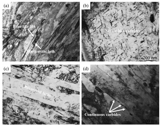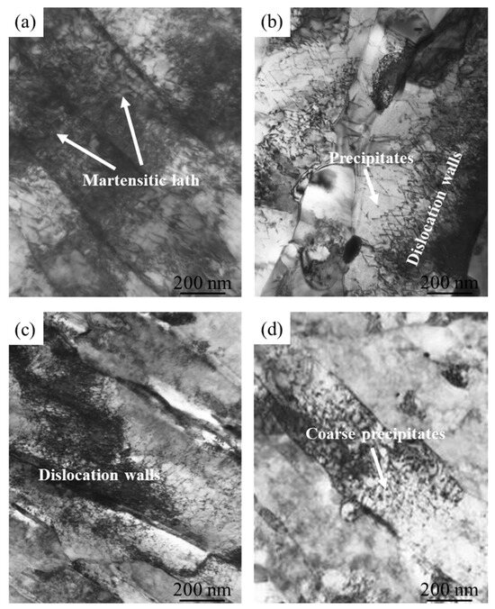 According to Figure 11a, the quenched structure under the QT process is still typical lath-like martensite, with high dislocation density, and there are some retained austenite films between laths. After tempering at 450 °C, a large number of elongated acicular carbides with obvious orientation relationships appear in the microstructure of the QT process, as shown in Figure 11b. When the tempering temperature rises to 550 °C, the microstructure is significantly coarsened, and acicular carbides still exist, but the number is significantly reduced and in a dissolved state. The dislocation density further decreases, and is mainly deposited at the coarsened lath boundary, as shown in Figure 11c. When the tempering temperature further rises to 650 °C, the lath-like structure can still be seen in the structure of the QT process. A large number of carbides are generated along the coarsened lath boundary, some of which have merged and grown. The dislocation distribution is disordered, but the presence of dislocations in place can still be observed, as shown in Figure 11d.