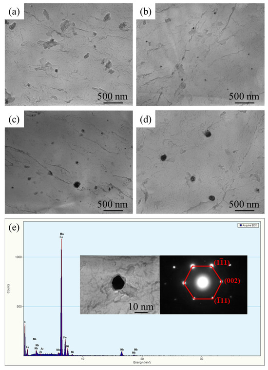 Micrographs and spectrum analysis of Nb precipitates under the DQT process. (a) As-quenched; tempering at (b) 450 °C, (c) 550 °C, (d) 650 °C; (e) energy spectrum analysis and SAED of precipitate.