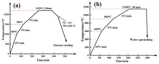 The preparation process involved mixing, injection, debinding, and sintering. Mixing was conducted at 140 °C with a speed of 30 revolutions per minute (r/min). Subsequently, injection was performed at 160 °C under a pressure of 100 bar. Following this step, cylindrical samples with a diameter of 25 mm and a thickness of 6 mm were obtained. For debinding, a two-step procedure was employed. Initially, microcrystalline wax was dissolved in n-heptane at 62 °C for 6 h, followed by the removal of the remaining binder through thermal debinding under flowing N2. Sintering and solution treatment were carried out in a tube furnace, with the heating and cooling curves depicted in Figure 1. Based on our previous research results, a relatively high sintering temperature of 1320 °C was chosen in Figure 1a to achieve higher density and strength without inducing liquid phase sintering. In Figure 1b, a solution treatment temperature of 1150 °C was selected to balance solubility efficiency and effectiveness. Detailed sample labels and their corresponding process parameters are provided in Table 3. In these labels, the numeric value at the beginning indicates the Celsius temperature when the atmosphere switches, with “N2” and “Ar” representing the atmosphere, and “ST” denoting solid solution treatment. Of note, this work proposes a novel process termed the “Sintering-Nitriding-Atmosphere Transition (SNAT)” process, wherein, after sintering and nitriding of the prefabricated billets, an atmospheric transition occurs during the cooling process. The duration of the atmosphere-switching process lasts approximately 1 min, after which the flow of the atmosphere is sustained. This method enables the direct attainment of a uniform microstructure with high-nitrogen content and a single-phase austenitic structure while eliminating the need for solid solution treatment in the conventional process.