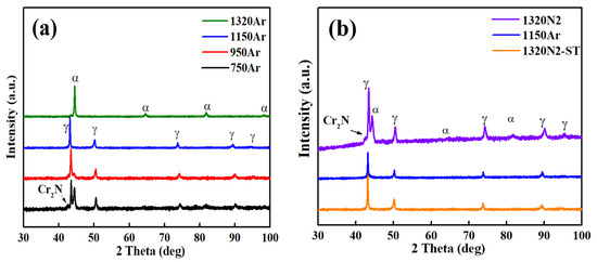 Figure 2b shows the XRD results of the 1320N2, 1320N2-ST, and 1150Ar steels. The phase constituents of 1320N2-ST and 1150Ar steels are single austenite phases. The austenitic peaks of 1320N2-ST and 1150Ar steels shift to the left, indicating that the inter-planar spacing of austenite grains is larger than that of 1320N2 steel. The presence of nitrogen in austenite as interstitial atoms will enlarge the crystal plane spacing [26], which indicates that the nitrogen contents in austenite of 1320N2-ST and 1150Ar are higher than that of 1320N2 steel. Further, 1320N2-ST obtains a high concentration of interstitial N atoms by quenching the supersaturated austenite. However, in the absence of rapid cooling, the interstitial N content in 1320N2-Ar austenite is also high. This appears to be due to the Ar atmosphere during cooling, which suppresses the precipitation of nitrides, allowing for more interstitial N retention in austenite.
