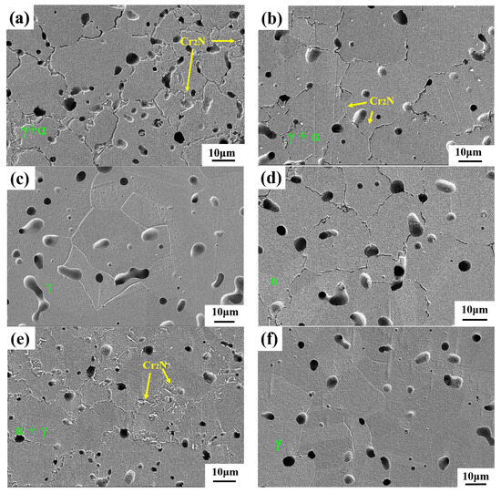 In Figure 3e, consistent with the XRD analysis results, the microstructure of 1320N2 includes austenite, α-Fe, and Cr2N phases, primarily distributed at the grain boundaries. Its phase composition and distribution microstructure are similar to those of 750Ar steel, albeit with a higher proportion of α-Fe and Cr2N, indicating more severe austenite decomposition during the cooling process. It can be inferred that austenite at the boundaries likely underwent two consecutive decompositions during cooling. Firstly, the continuous nitrogen diffusion led to nitrogen content surpassing the solid solubility limit of Cr2N, resulting in the decomposition of supersaturated austenite into austenite and Cr2N: γ supersaturation → γ and Cr2N. After the first decomposition, both chromium and nitrogen content in the austenite decreased, further weakening its stability, leading to a second decomposition into ferrite and Cr2N: γ → α and Cr2N. Moreover, the solubility of nitrogen in austenite gradually decreased during the cooling process, and since Sample 1320N2 maintained a nitrogen atmosphere throughout the entire cooling process, nitrogen escape was inhibited, thus intensifying the aforementioned decomposition. Given this, nitrided steels often require solution treatment. After solution treatment at 1150 °C for 1.5 h, the Cr2N dissolved, and the α-Fe transformed back into austenite. As observed in Figure 3f, the microstructure in the interior of 1320N2-ST steel is a single austenite phase.