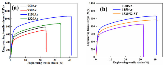 Figure 6 presents the engineering stress–strain curves of the steels, with their tensile properties summarized in Table 4. Figure 6a compares the tensile mechanical properties at different transition temperatures. Among these, the 1150Ar steel demonstrates the most outstanding strength and ductility, with a yield strength of 749 MPa, ultimate tensile strength of 1030 MPa, and elongation of 38.7%. This indicates that high-nitrogen austenitic steel can achieve the best strength–ductility combination. The mechanical properties of the 1320Ar steel, with a single-phase ferrite matrix, are slightly inferior due to its lower nitrogen content compared to the former. Meanwhile, both 750Ar and 950Ar steels exhibit the poorest mechanical properties, with elongation decreasing to approximately 20%, primarily attributed to the generation of Cr2N at grain boundaries. During tensile testing, the presence of Cr2N precipitates interacts with dislocations, resulting in the formation of dislocation tangles around the nitrides. Consequently, the Cr2N precipitates act as crack initiation sites, accelerating crack propagation, thus reducing tensile strength and deteriorating ductility. This phenomenon has also been reported by Hu et al. [30] and Zheng et al. [31].