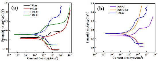 Figure 8b illustrates that both the 1320N2-ST and 1150Ar steels exhibit higher polarization resistance and lower corrosion current density compared to 1320N2 steel. This improvement can be attributed to the high nitrogen content in the austenitic matrix [32]. However, the microstructure of 1320N2 includes austenite, α-Fe, and Cr2N. On one hand, the precipitation of Cr2N results in the depletion of Cr and N in austenite, which will reduce the corrosion resistance. On the other hand, the nitrides and α-Fe increase the number of galvanic cells in the electrochemical corrosion system and aggravate the intergranular corrosion. Therefore, by strictly controlling the N content and reducing the precipitation of nitrides, the corrosion resistance of the high-nitrogen austenitic stainless steel can be effectively improved.