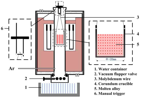 The temperature of furnace was increased from 25 °C to 1680 °C with a heating rate of 10 °C/min and kept for 30 min to melt the alloy samples. Then, the samples were cooled to a target temperature (1400 °C, 1200 °C, 1000 °C, 800 °C, 600 °C, 400 °C, and 200 °C) in the furnace and held for 2 min. After that, the vacuum flapper valve (2) was opened, and the push-down suspension trigger was pushed to allow the corundum crucible to drop into the water container (1) for water quenching.