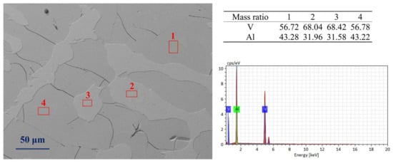 The SEM image (Figure 1) shows that this alloy sample is the original alloy from the production site, composed of two phases regions: (1) micro regions (labeled as 1 and 4) are the matrix of the observation area, with vanadium content ranging from 55% to 56%, belonging to the Al8V5 phase; (2) micro regions (labeled as 2 and 3) are the precipitates of the observation area, with vanadium content ranging from 66% to 68%, belonging to the vanadium–aluminum solid solution phase.