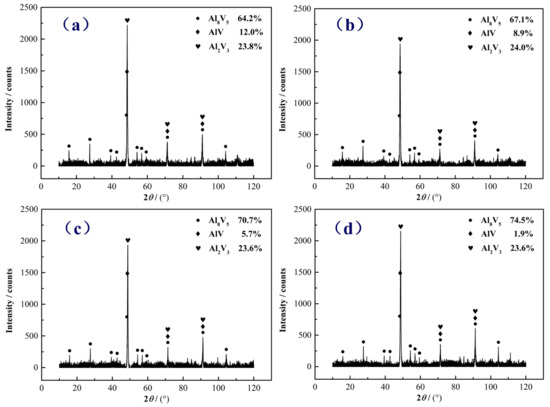 where , , and represent the vanadium content of AlV55 alloy, Al8V5 phase, and vanadium–aluminum solid solution phase, respectively. is the mass of AlV55 alloy, and and are the mass of Al8V5 phase and the mass of vanadium–aluminum solid solution phase, respectively. is the density of i, is the mass of i, is the volume of i, i is the Al8V5 phase and the vanadium–aluminum solid solution phase, is the volume fraction of the vanadium–aluminum solid solution phase, and and are the volume of the vanadium–aluminum solid solution phase and the volume of Al8V5 phase, respectively.
