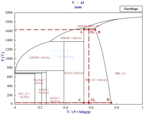Figure 6 shows the metallographic diagram of the vanadium–aluminum alloy. The diagram is produced by FactSage 6.4. Based on the vanadium mass fraction of 58% of the vanadium–aluminum alloy, it is in the O1O2 position in Figure 6. The complete solidification temperature of the alloy is approximately 1650 °C. During the entire solidification process of the alloy, when the temperature is higher than 1650 °C, the liquid phase precipitates vanadium–aluminum BBC_A2 phase (the solid solution phase of vanadium–aluminum). When the temperature is lower than 1650 °C, there are two phases, the solid solution phase of vanadium–aluminum and Al8V5 phase. When each temperature reaches equilibrium, as the temperature decreases, the ratio of Al8V5 phase gradually increases, while the mass fraction of vanadium–aluminum solid solution phase gradually increases, and the proportion of vanadium–aluminum solid solution phase gradually decreases.