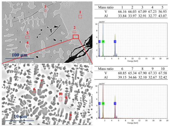 Figure 7 shows SEM images’ microscopic details of the vanadium–aluminum solid solution phase in the vanadium–aluminum alloy, which is water-quenched at 600 °C. The scanning point (1, 2, 3, 4) in the image on the left is the precipitated vanadium–aluminum solid solution phase, and the scanning point 5 is the matrix Al8V5 phase. It can be observed from green zone in the image that the vanadium–aluminum solid solution phase precipitated at scanning point 2 is micro-spotted, which appears to be quite different from the rest. A further magnified green zone (the image on the bottom of Figure 7) shows two phases with light and dark colors. The dark colored phase is dotted in the light-colored phase. SEM-EDX shows that the mass fractions of vanadium at scanning points 6, 7, 8, 9 are 60.85%, 65.34%, 67.90%, and 67.33%, respectively. At scanning point 10 of the light-colored matrix phase, the mass fraction of vanadium is determined to be 67.58%. Therefore, the color depth of the phase here cannot reflect the change in vanadium mass fraction. It belongs to the vanadium–aluminum solid solution phase as a whole and is in the process of phase transformation.