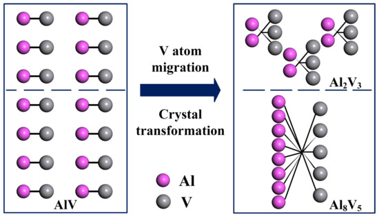 As the temperature decreases, the AlV phase in vanadium–aluminum alloy gradually transforms into Al8V5 phase and Al2V3 phase. From a crystallographic perspective, 3/14 of the vanadium atoms in AlV phase crystals migrated, forming Al8V5 and Al2V3 crystals, as shown in Figure 8, resulting in crystal transformation.