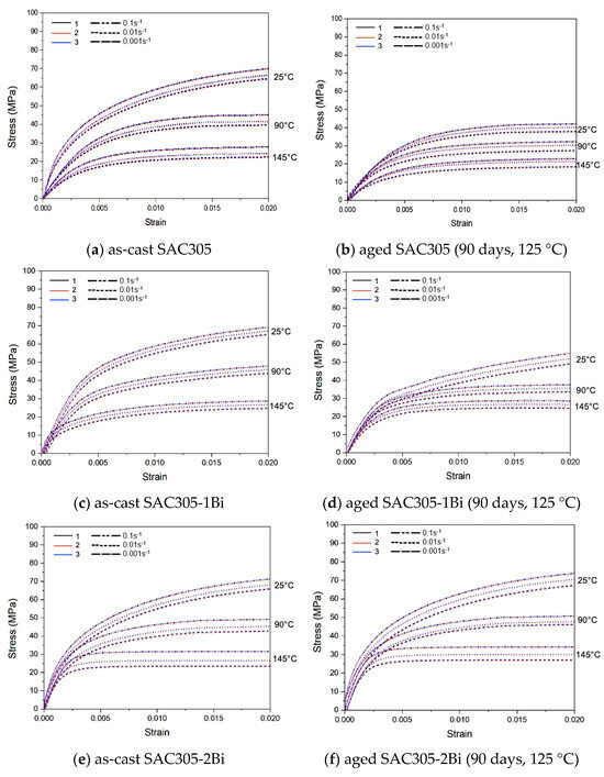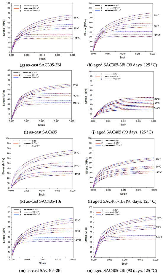 For all alloys in their as-cast conditions and after an isothermal aging of 90 days at 125 °C, three overlapping stress–strain plots are plotted in Figure 2 for each aging and testing condition. As evident from the plots, all solder alloys show loading rate-dependent deformation behavior or viscoplasticity. When deformed at higher strain rates, all alloys show higher strength than deformation at slower strain rates. As expected, a higher testing temperature results in lower strength. Moreover, the SAC305, SAC305 + 1 wt.%Bi, SAC405, and SAC405 + 1 wt.%Bi alloys show significantly reduced tensile strength after aging. On the contrary, alloys containing more than 2 wt.% Bi, i.e., SAC305 + 2 wt.%Bi, SAC305 + 3 wt.%Bi, SAC405 + 2 wt.%Bi, and SAC405 + 3 wt.%Bi, show increased strengths after aging. This indicates that doping SAC305 and SAC405 alloys with 2 to 3 wt.% Bi could lead to improved mechanical performance in these alloys, particularly after high-temperature storage.