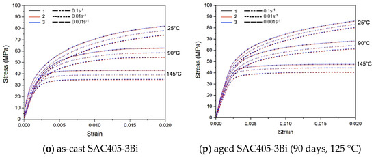 Stress–strain plots of (a) as-cast SAC305, (b) aged SAC305 (90 days, 125 °C), (c) as-cast SAC305 + 1 wt.%Bi, (d) aged SAC305 + 1 wt.%Bi (90 days, 125 °C), (e) SAC305 + 2 wt.%Bi, (f) aged SAC305 + 2 wt.%Bi (90 days, 125 °C), (g) as-cast SAC305 + 3 wt.%Bi, (h) aged SAC305 + 3 wt.%Bi (90 days, 125 °C), (i) as-cast SAC405, (j) aged SAC405 (90 days, 125 °C), (k) as-cast SAC405 + 1 wt.%Bi, (l) aged SAC405 + 1 wt.%Bi (90 days, 125 °C), (m) as-cast SAC405 + 2 wt.%Bi, (n) aged SAC405 + 2 wt.%Bi (90 days, 125 °C), (o) as-cast SAC405 + 3 wt.%Bi, and (p) aged SAC405 + 3 wt.%Bi (90 days, 125 °C).