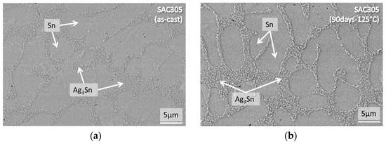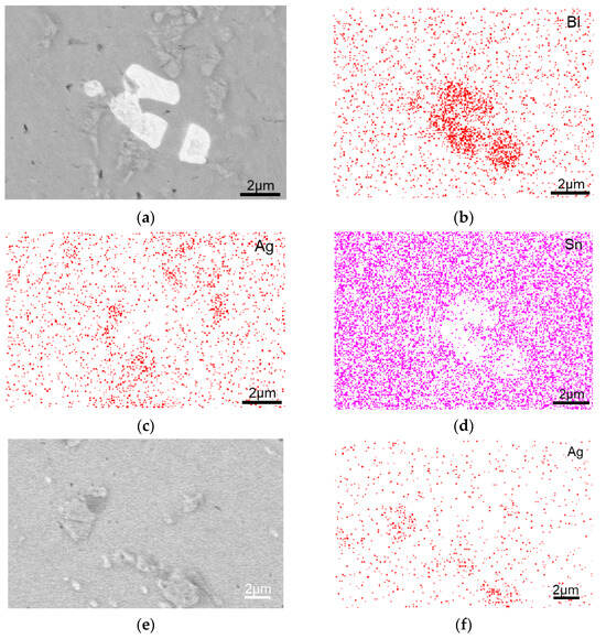 Several phases were observed in backscattered electron (BSE) SEM images, and EDS was used for phase identification [31]. In Figure 3, for the SAC305 + 3 wt.%Bi sample aged for 90 days at 125 °C, the backscattered electron micrograph of a region within the sample (Figure 3a) is shown along with the EDS mapping of Bi (Figure 3b), Ag (Figure 3c), and Sn (Figure 3d) for the same region. The bright phase was rich in Bi, the grey particles were rich in Ag, and the matrix was Sn-rich. Figure 3e,f show the BSE image and EDS Ag mapping of another region, where gray particles that are rich in Ag were seen scattered in the Sn-rich matrix. Correlating these results to the phase diagrams of Sn-Ag and Sn-Bi [32,33], the Ag-rich particles were identified as Ag3Sn, the Bi-rich phase was identified as Bi precipitate, and the matrix was identified as elemental β-Sn. The phases determined from the SEM/EDS studies were consistent with literature reports of similar SAC + Bi alloys [8,34].